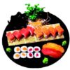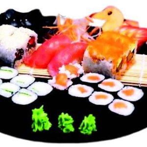 12 fried salmon futomaki, 8 salmon sashimi, 4 tuna sashimi, 4 shrimp sashimi, 24 uramaki (8 avocado, 8 caviar, 4 salmon, 4 tuna), 8 nigiri (3 salmon, 3 tuna, 2 shrimp). 24 maki (8 tepmura shrimp, 8 salmon-avocado, 8 omelette