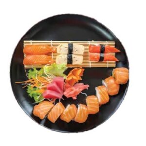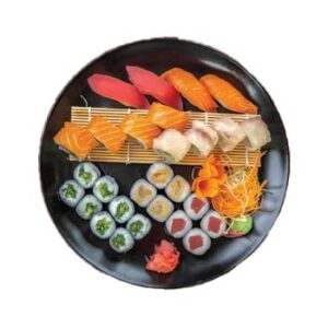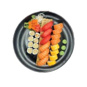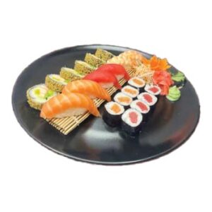3 sült sushi lazac , 3 lazac nigiri , 4 lazac uramaki 4 kaviár uramaki ,8 surimi maki , 4 lazac maki , 4 tonhal maki