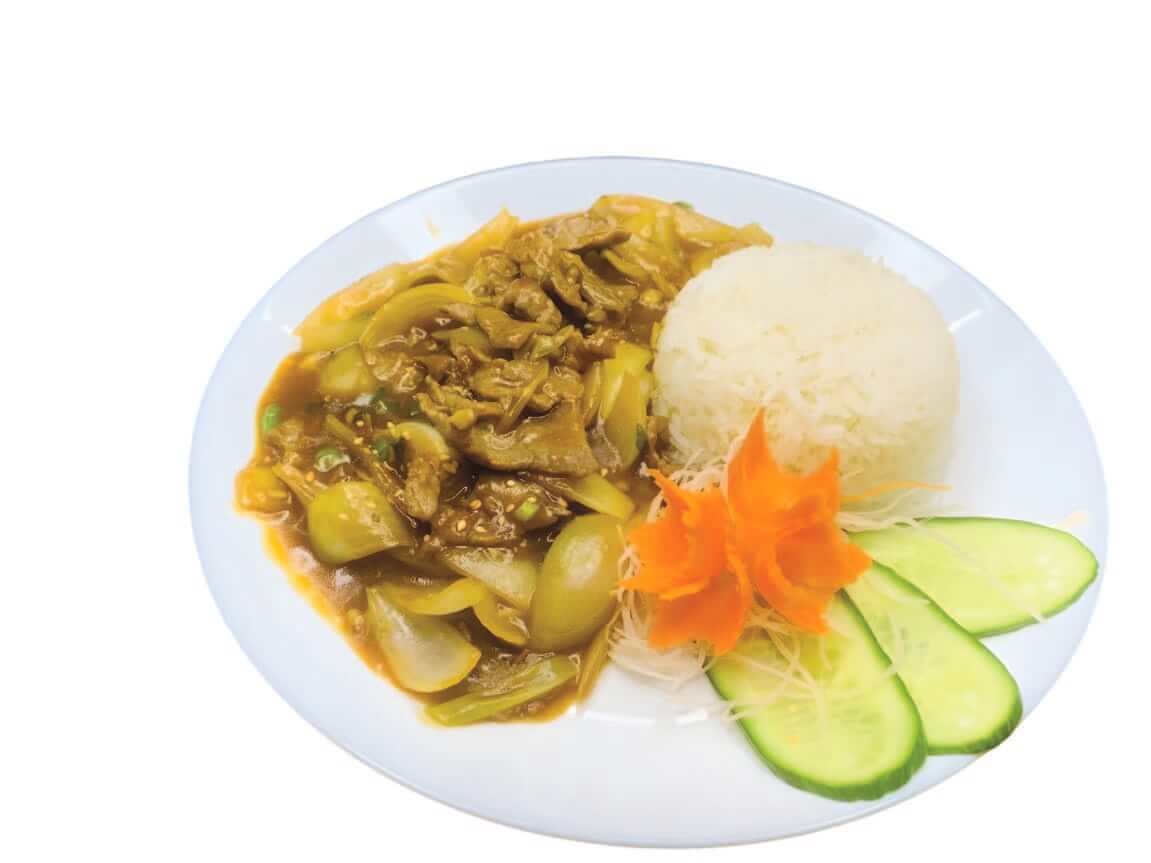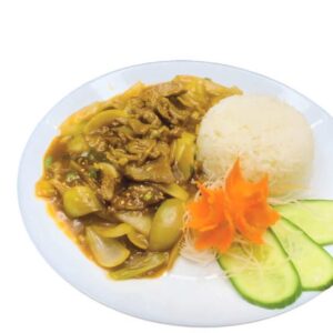 Japán stílusú marhahús, hagyma, újhagyma, rizzsel tálalva, pirított hagyma